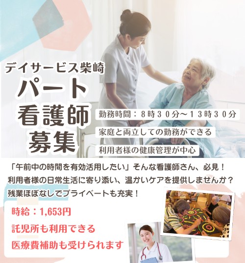 | 仕事内容 | デイサービスにおいて ◆高齢者及び認知症高齢者に対する健康管理、配薬、その他看護業務全般。 ◆高齢者の機能訓練  |