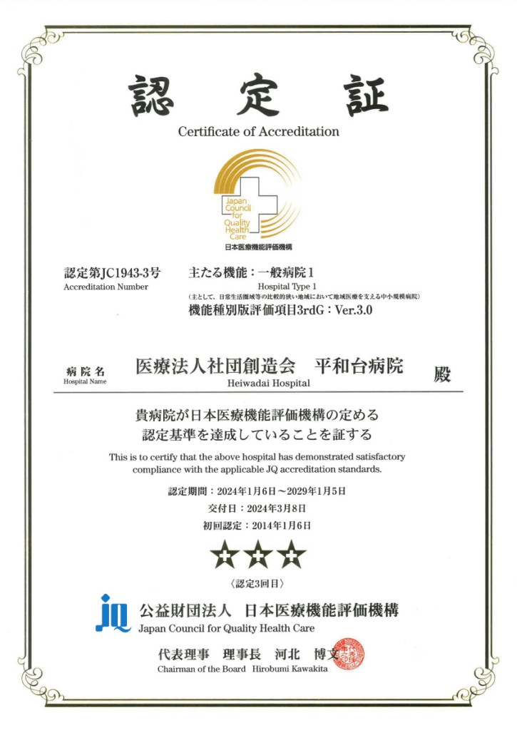 平和台病院が病院機能評価の3回目の認定を受けました。