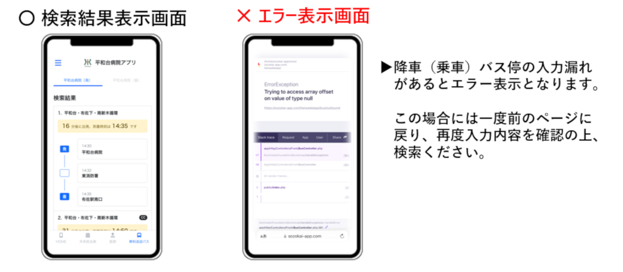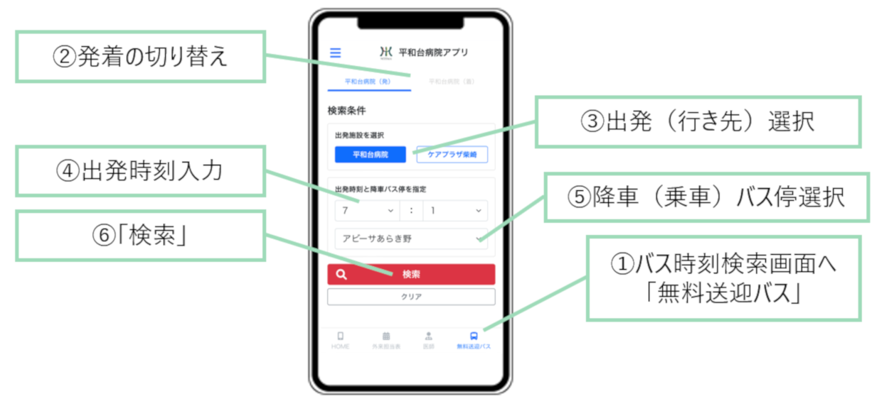 ※平和台病院行きのバス時刻を検索の場合には、病院着(行き)の条件設定に変更します。