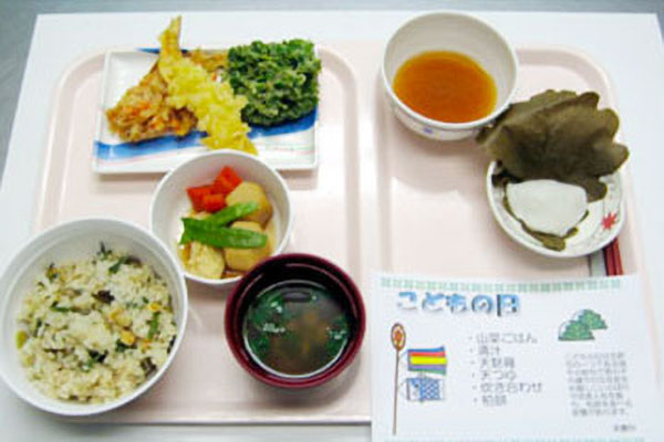 四季折々の旬の食材を使用した毎月の行事食では、患者様に季節感を味わっていただいています。楽しく召し上がっていただくために、行事食のカードも添えています。