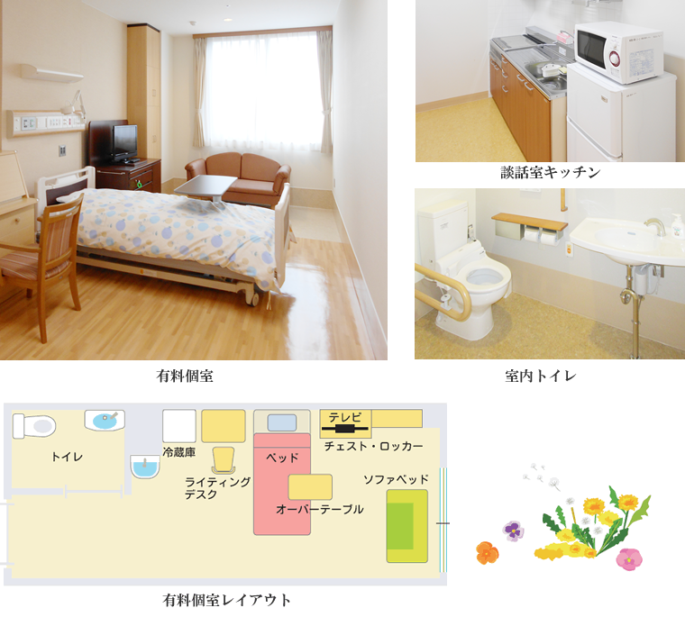 有料個室10床: シャワー付き個室(2床):3500円/日+税 個室(8床):3000円/日+税 無料個室10床