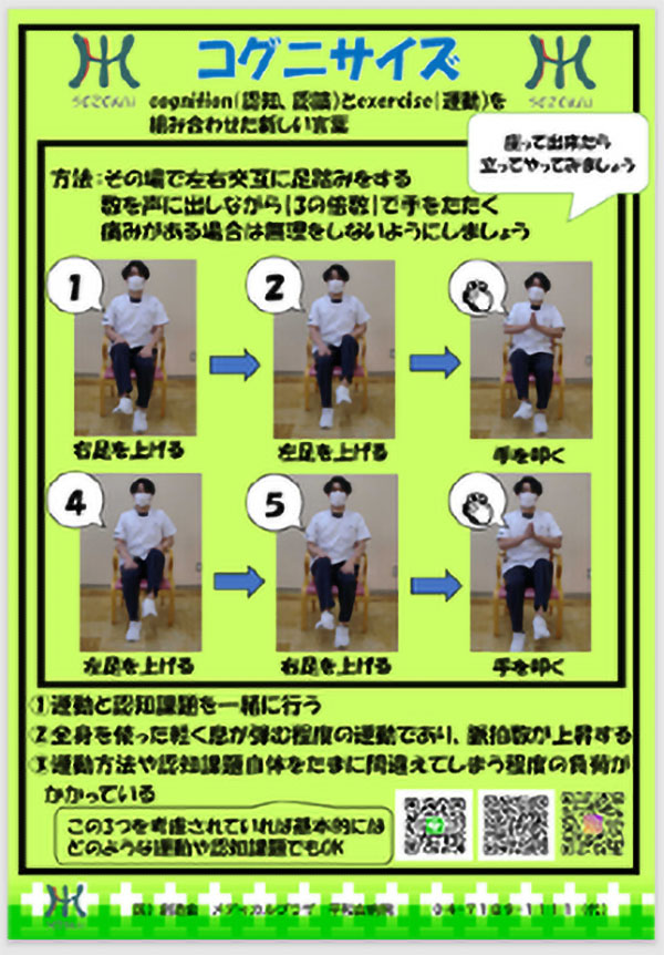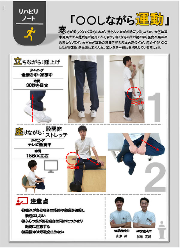 SNSやインターネットを普段、利用されない方へも健康情報を発信出来るように、自治体にご協力を頂き月に1回チラシ配付を行なっております。チラシ内ではご自宅で簡単に出来る運動をご紹介しております。
