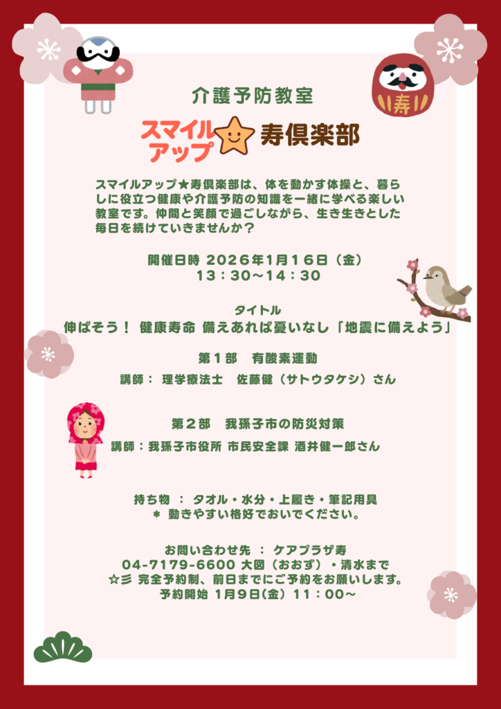 ケアプラザ寿では、毎月第3金曜日に介護予防教室「スマイルアップ☆寿倶楽部」を開催しています。