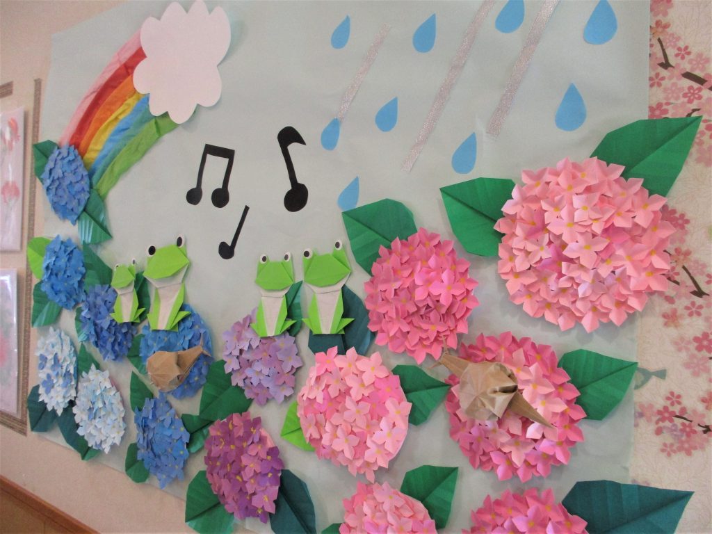 クレオでは各ユニットとも、廊下や食堂に紫陽花の壁面装飾が登場しています。ユニットごとにデザインいろいろで、見てまわると面白いです (*^-^*)。