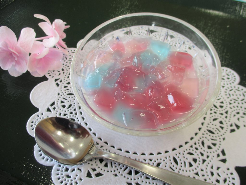 写真ではちょっと分かりづらいですが、杏仁豆腐の上にピンクやブルーのゼリーを乗せ、あじさいをイメージ。