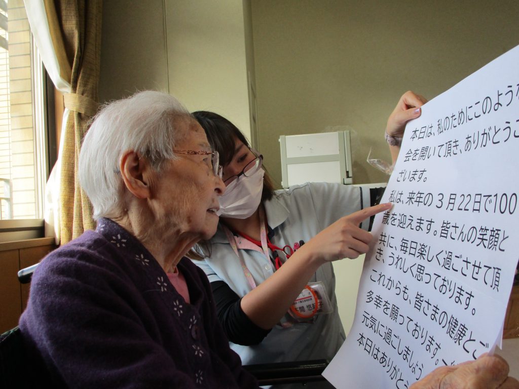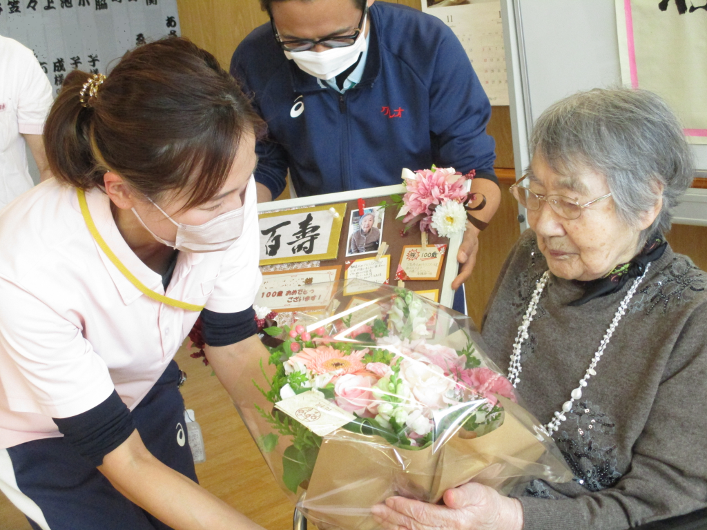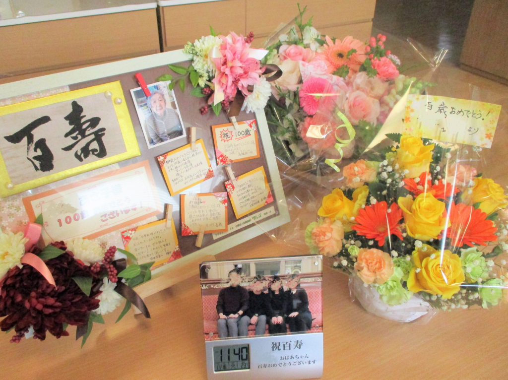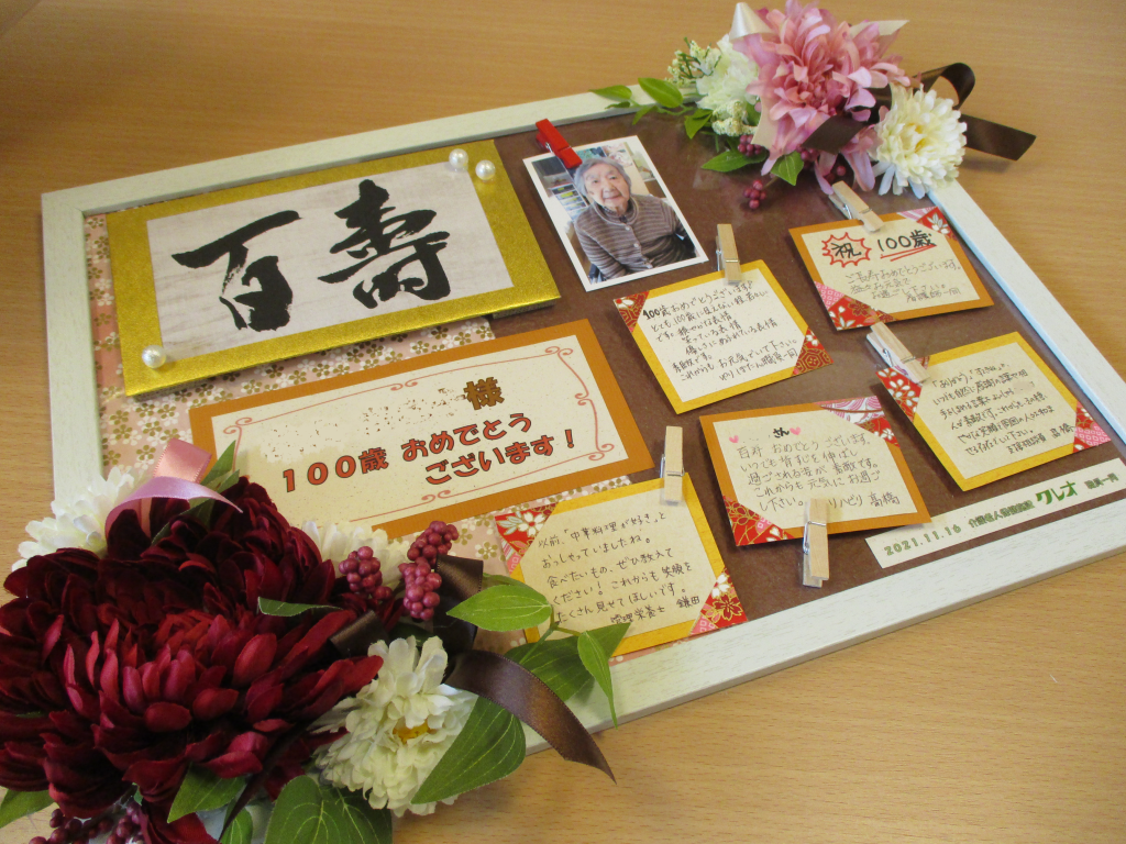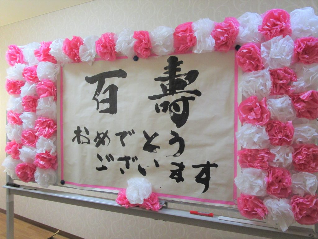 久々の更新となります~。更新お休み中の夏から秋にかけても、施設内ではいろいろな行事を企画・開催してきましたが、今回は今年度100歳を迎えるご利用者様のお祝い行事をご紹介します。