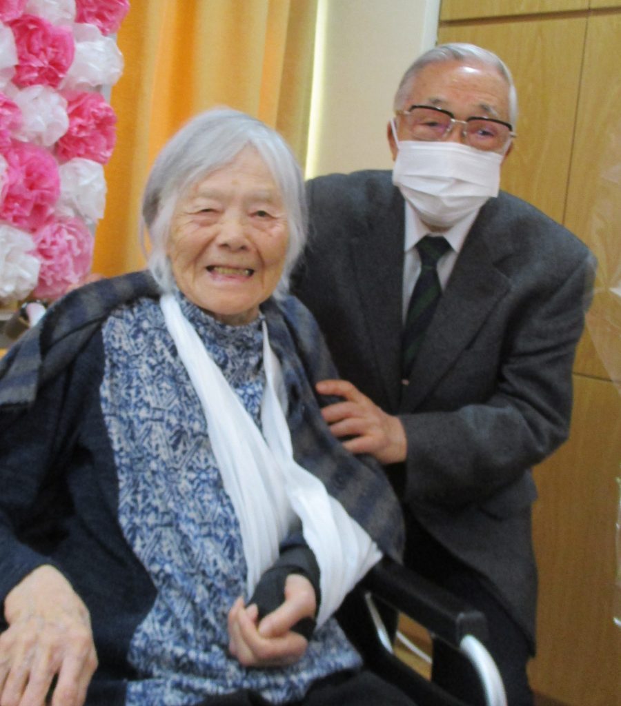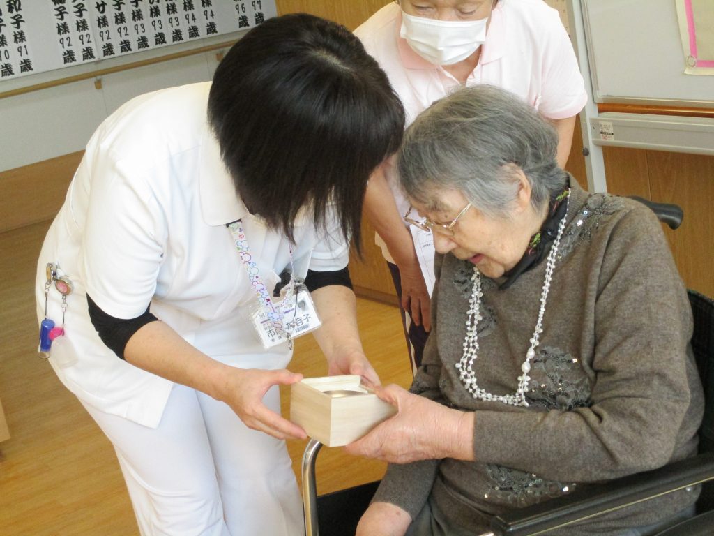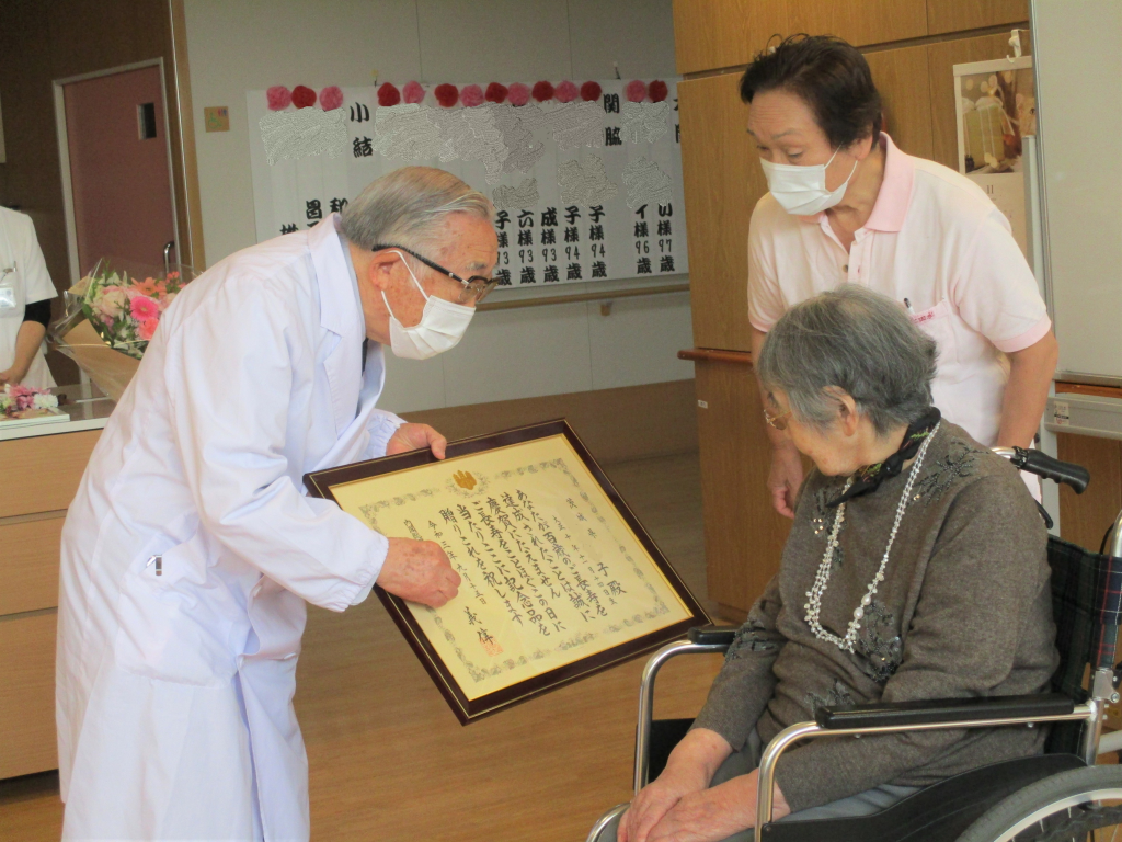 百寿を祝う会では、渡邊施設長から、内閣総理大臣からの賞状(現在、代が替わってしまいましたが、こちらの賞状は菅義偉総理より)を読み上げ、贈呈させていただきました。