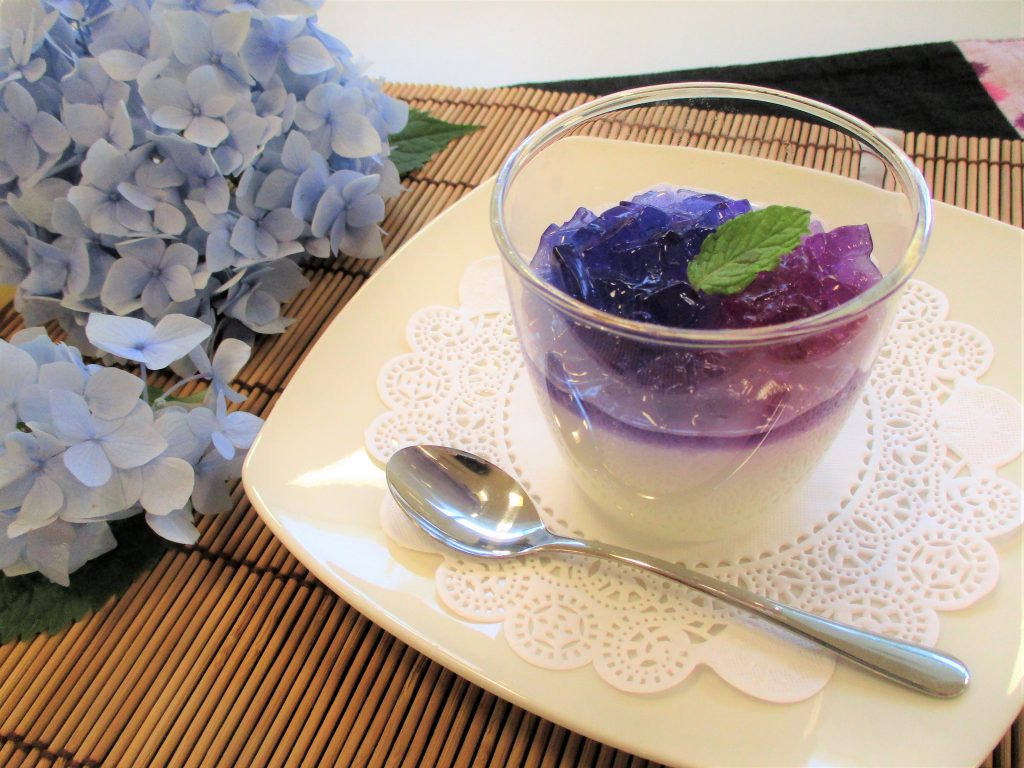 見た目にも爽やかな、紫陽花ゼリーが出来上がりました♪