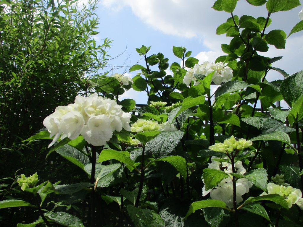 クレオ2階のベランダ花壇では、今年は紫陽花の花がたくさん咲きましたが、とにかく雨が少なく、水切れしないように連日水やりの日々が続いています…。
