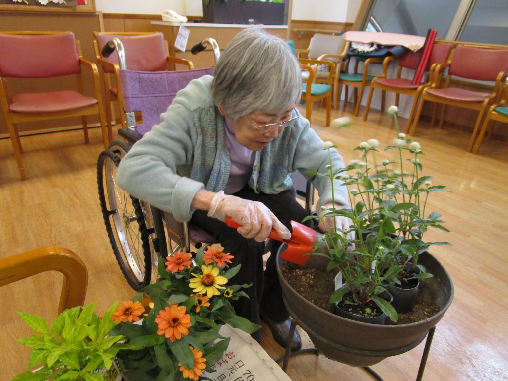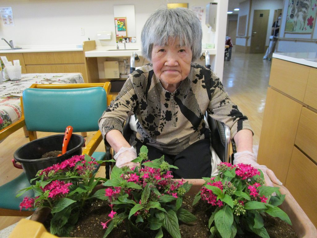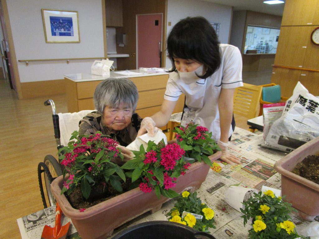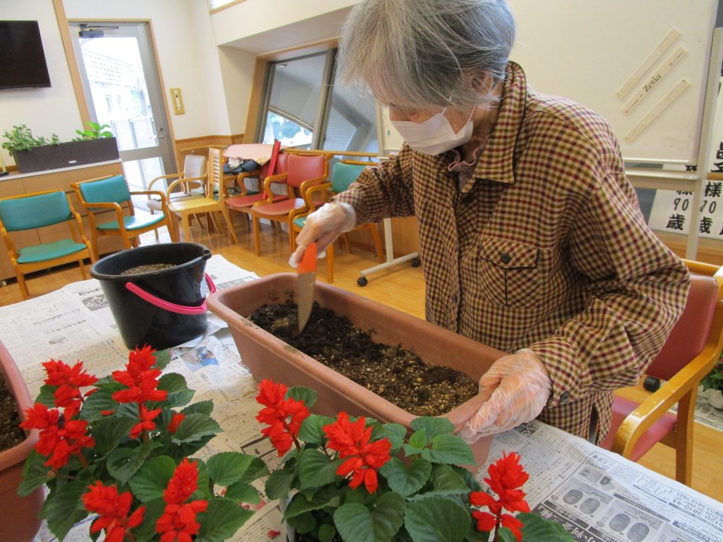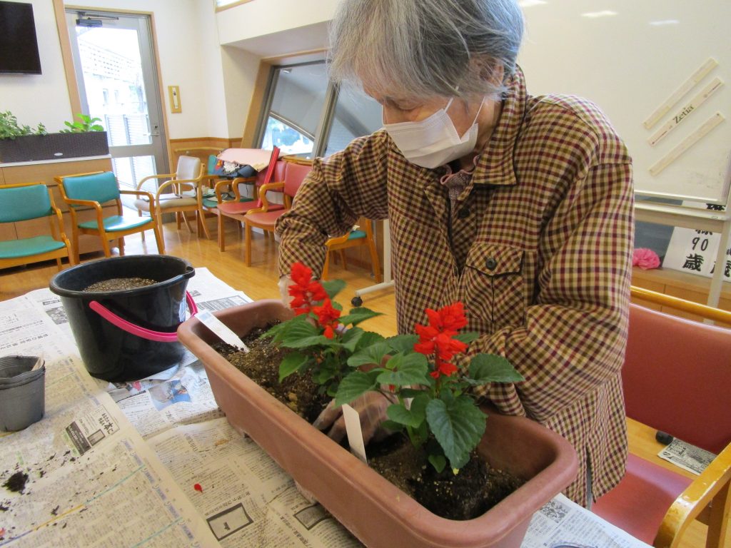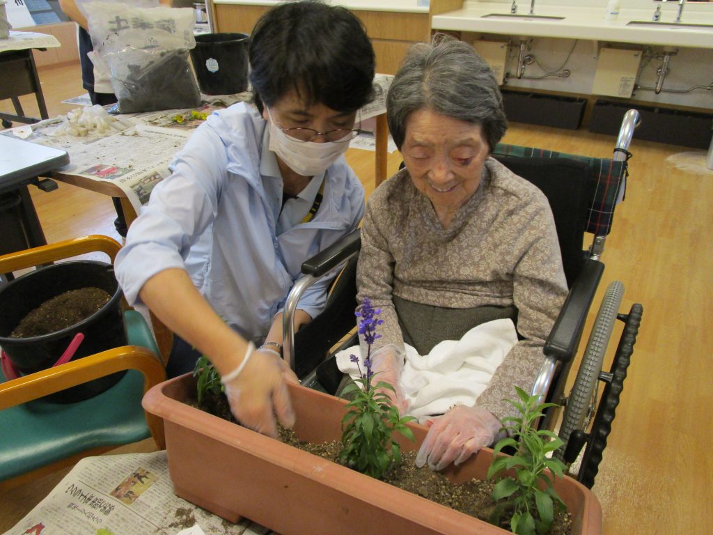2日間に分け、13人の入所者様と一緒に、12個のプランターと花壇の植え付けをおこないました。