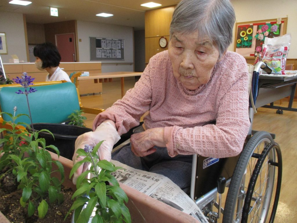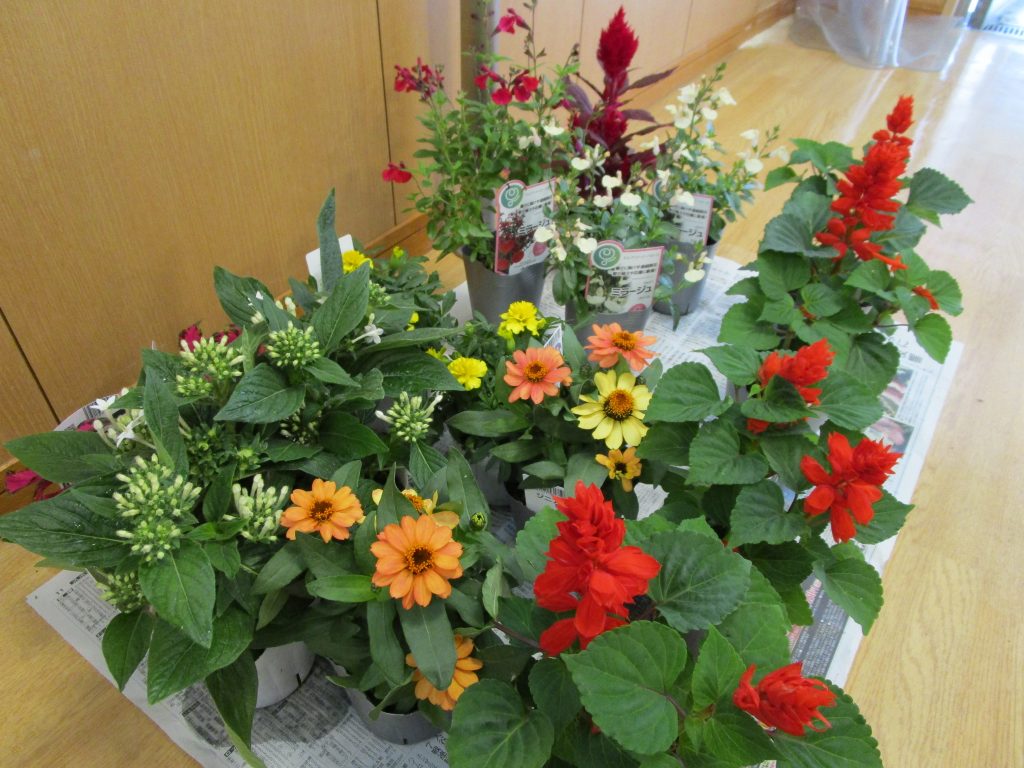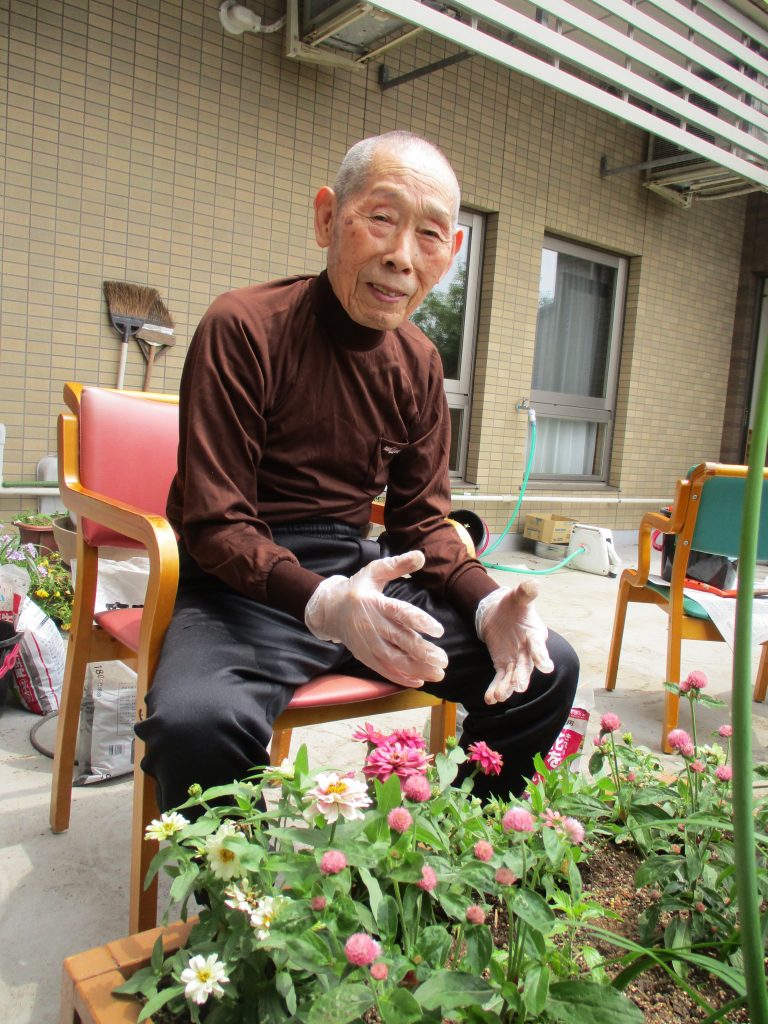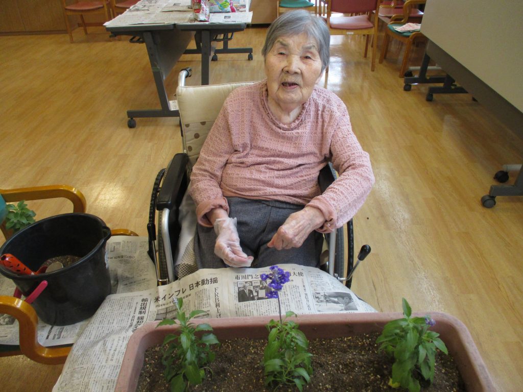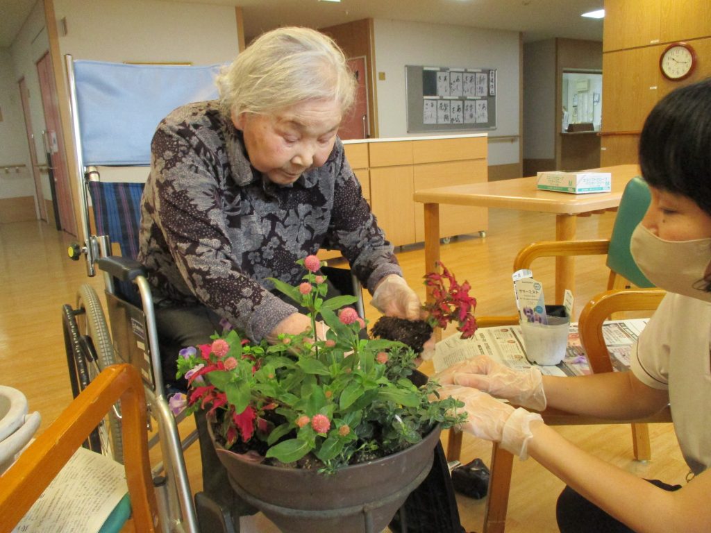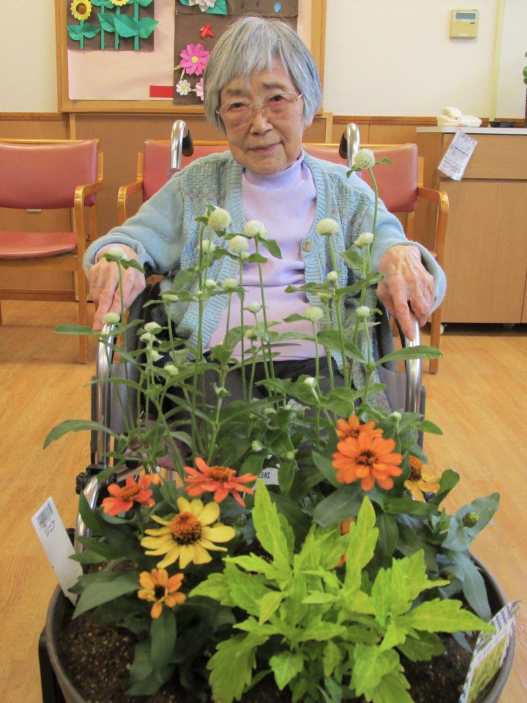 2日間に分け、13人の入所者様と一緒に、12個のプランターと花壇の植え付けをおこないました。