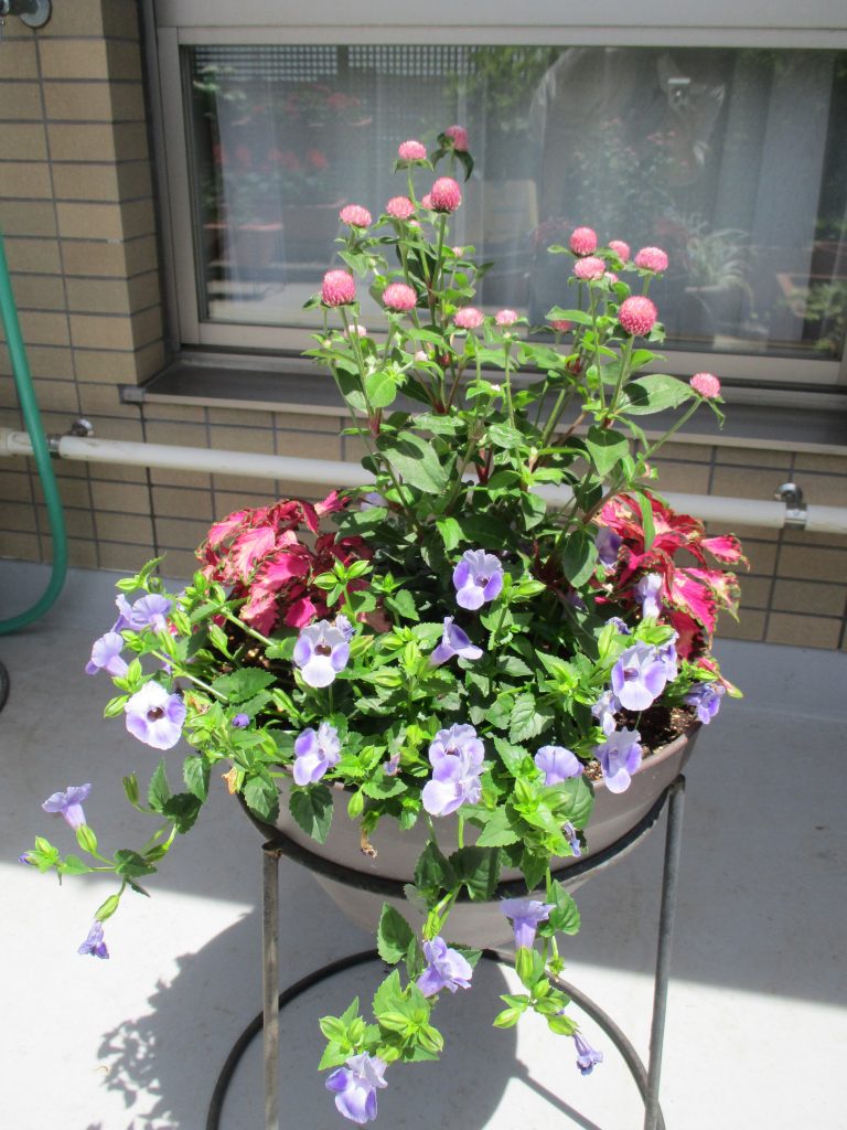 こちらはピンクの千日紅とレッドリーフのコリウス、薄紫のトレニアの寄せ植えです。