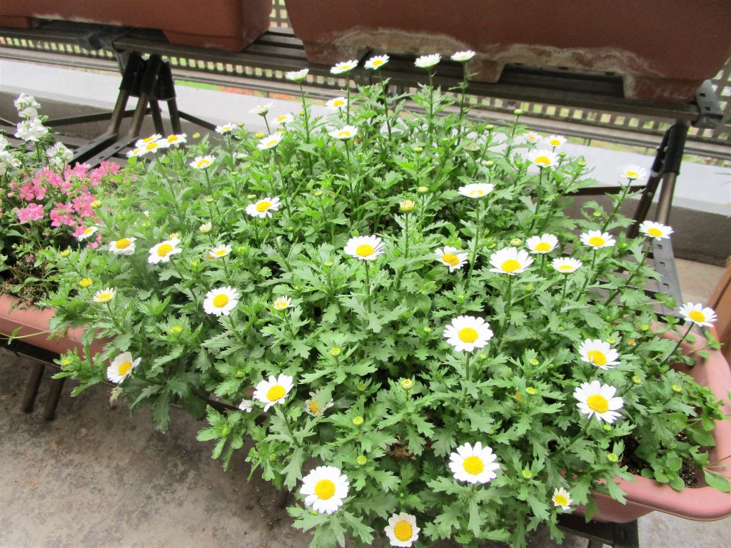角プランターに植えた、パンジーとクリサンセマム・ノースポールは…