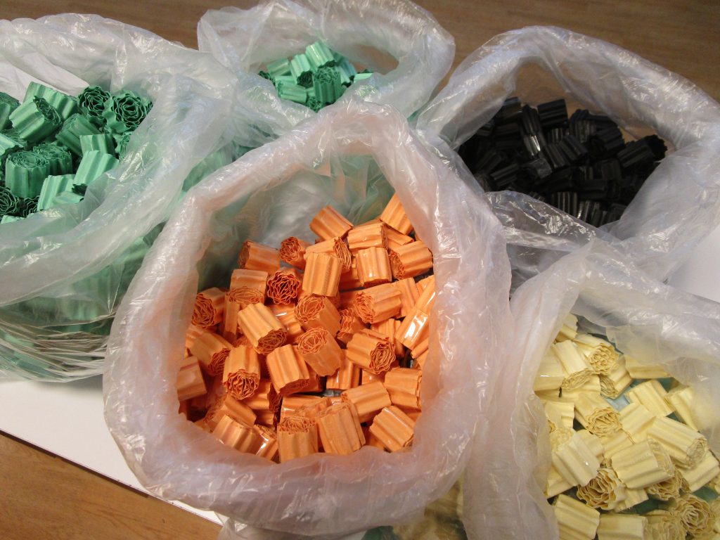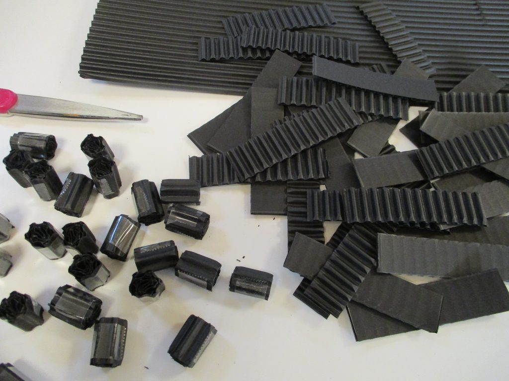 まずは貼り絵の部品となるこのカラーダンボールを2cmの高さに切り、くるくるくる・・・と丸めていきます。こちらの黒だけでなんと、1000個くらい使います!
