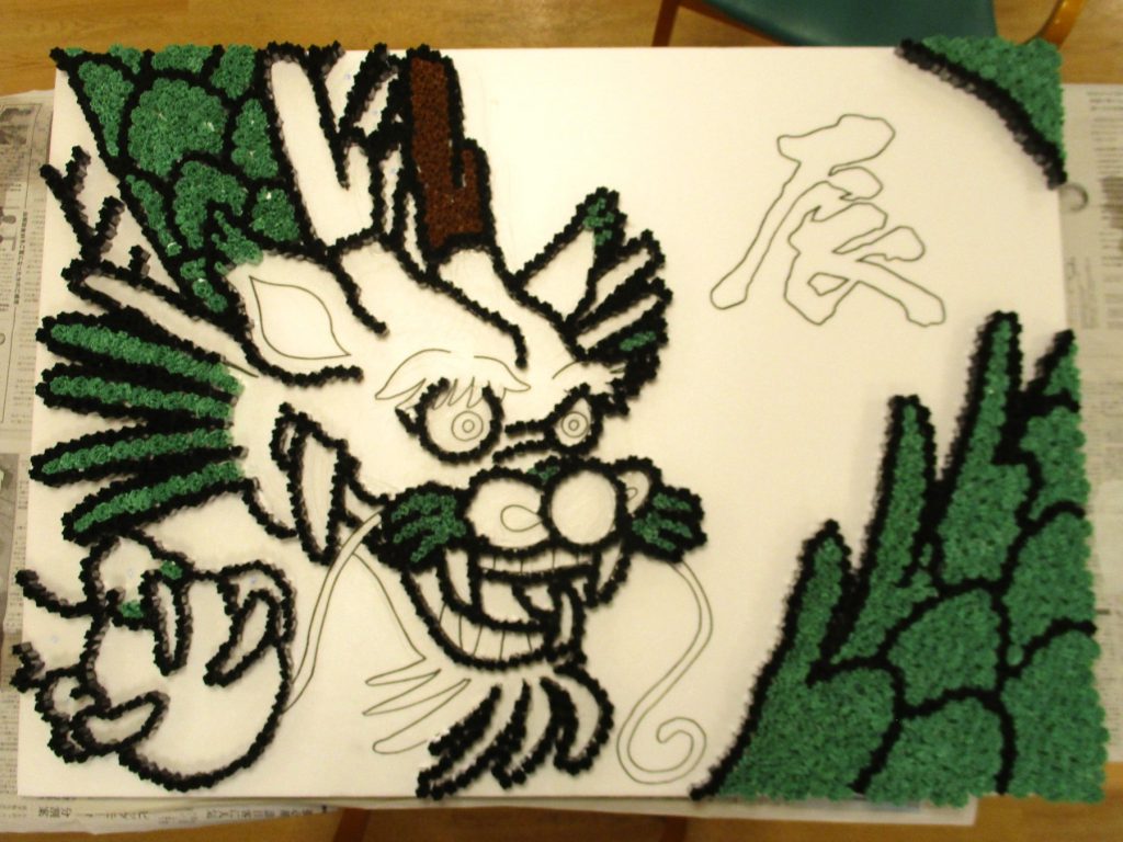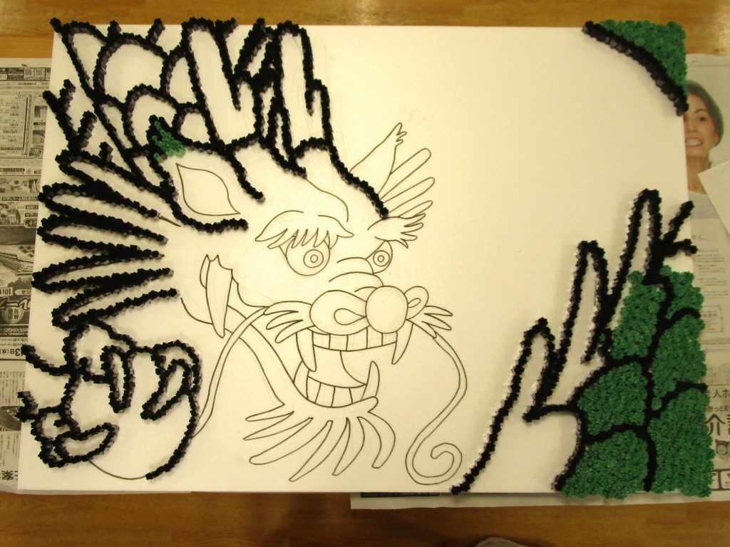 辰の絵が概ねできてきたので、背景用に作ったお花紙の白い玉を背景に貼っていきます。こちらはボンドで固定しようとしても丸くて動いてしまうので、なかなかに難しいですね~。