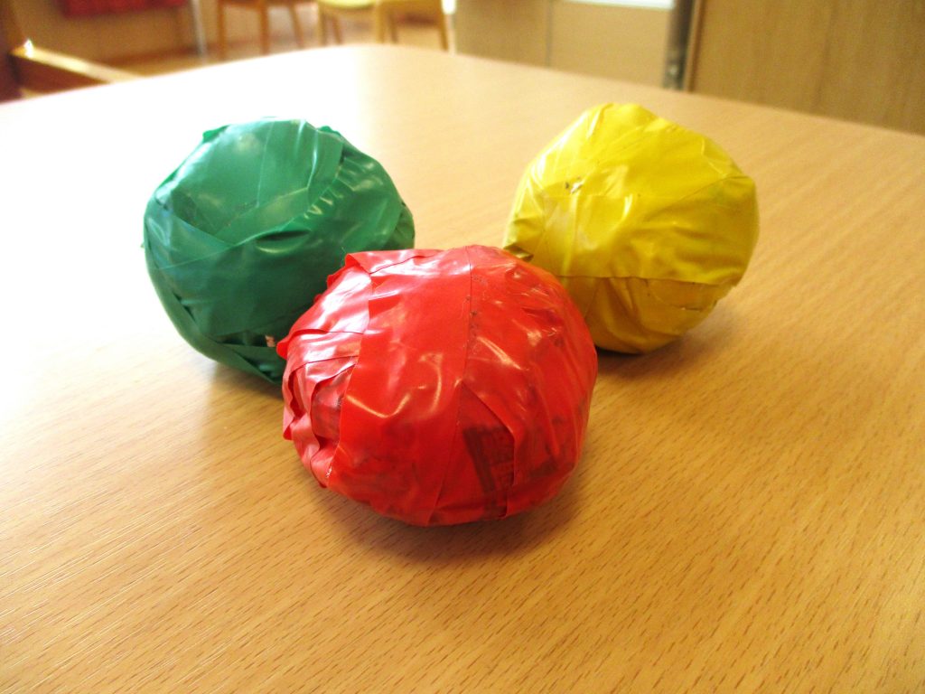 丸めた新聞紙にビニールテープを巻き付けボール状にしています。