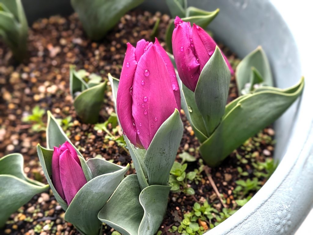 園芸クラブの庭では、早くも秋に植え付けたチューリップが花開きました。