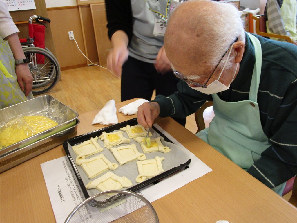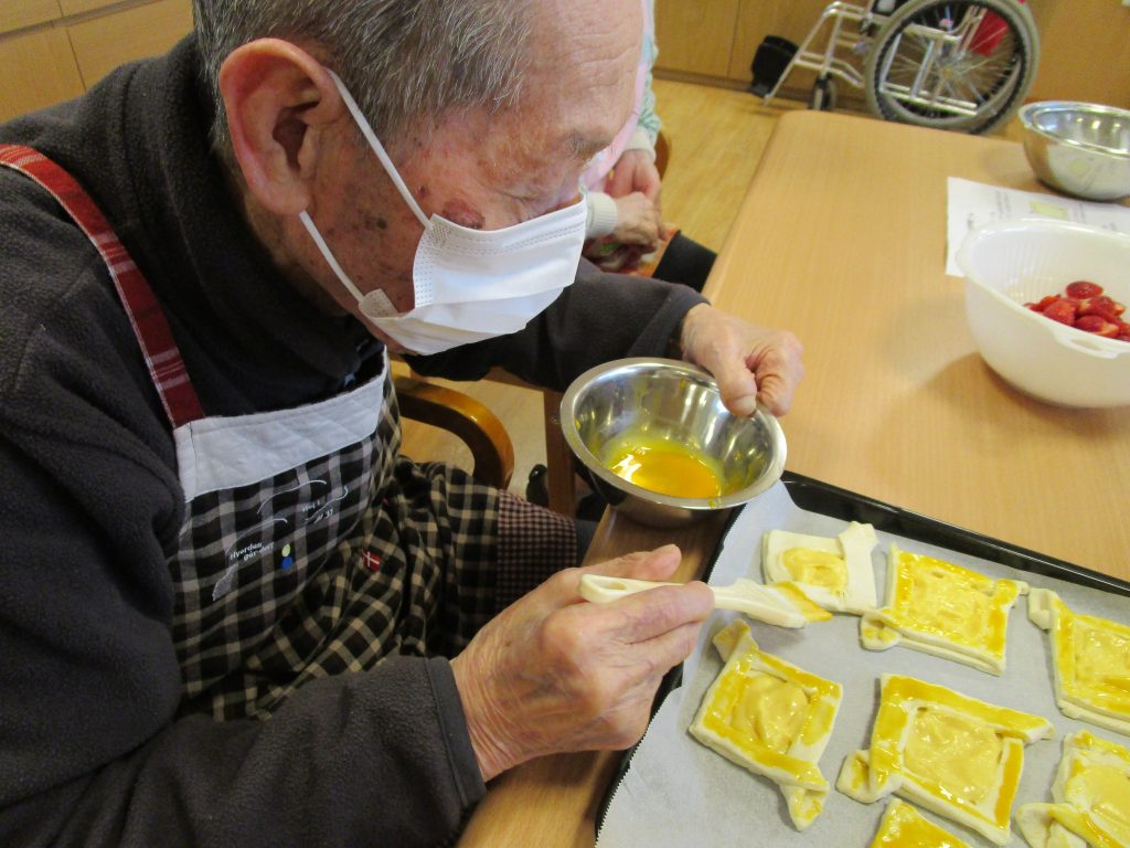 クリームの粗熱がとれたら、パイ生地の中央に乗せ、まわりに溶き卵を塗ります。