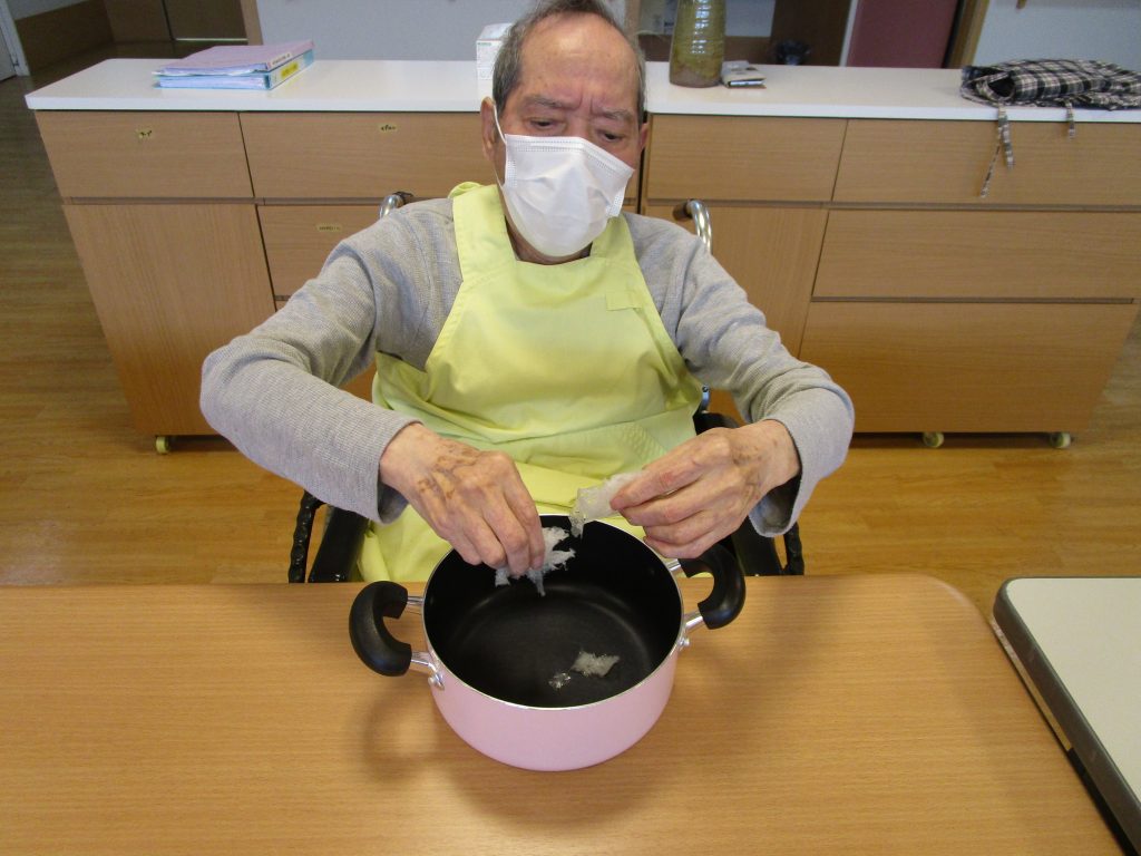 ちぎったら、水と一緒に火にかけ、煮溶かします。