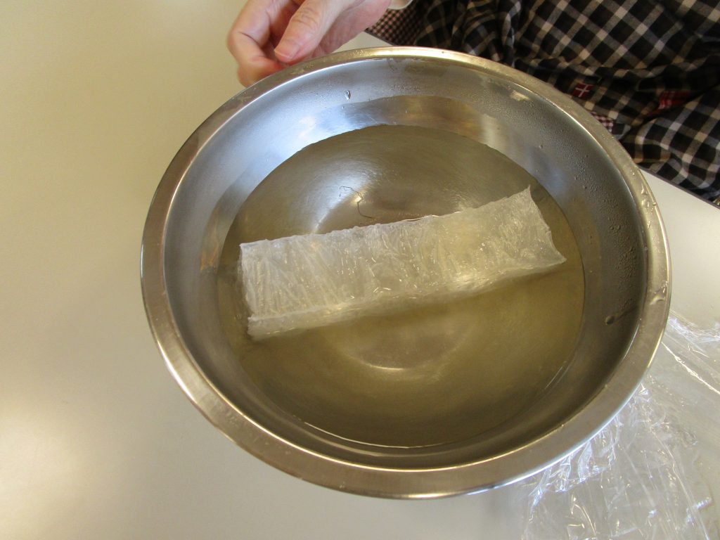 あらかじめ3時間ほど水に浸けてふやかしておいた寒天を、水気を切って細かくちぎります。