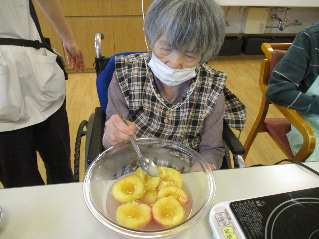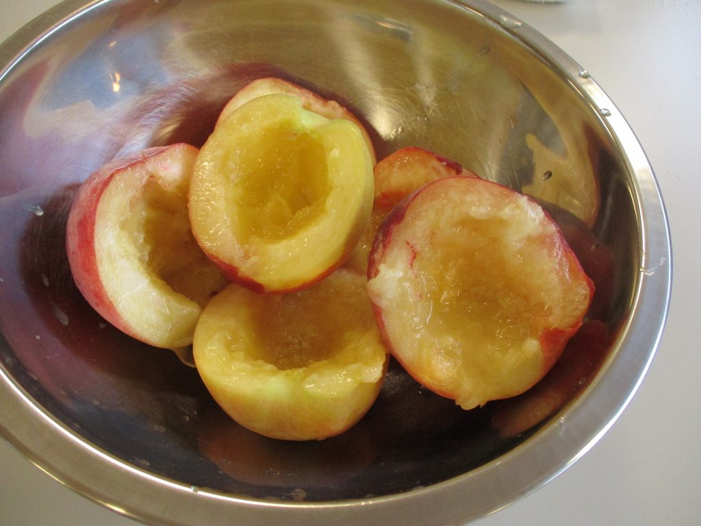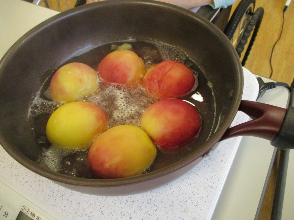 砂糖を入れた水を火にかけ、桃を皮ごとグツグツ煮ます。