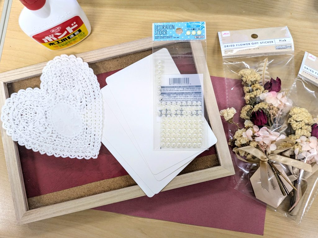 ダ〇ソーで大量注文した「コレクションケース」に赤のレザックの台紙、ハートのレースペーパーを貼ります。