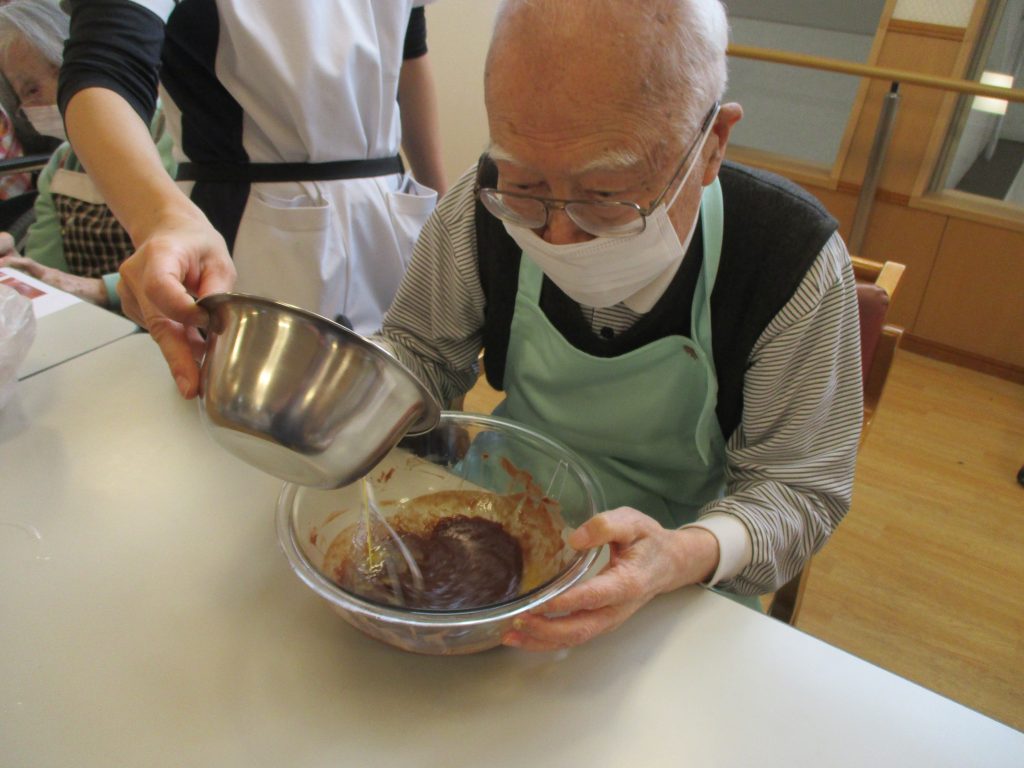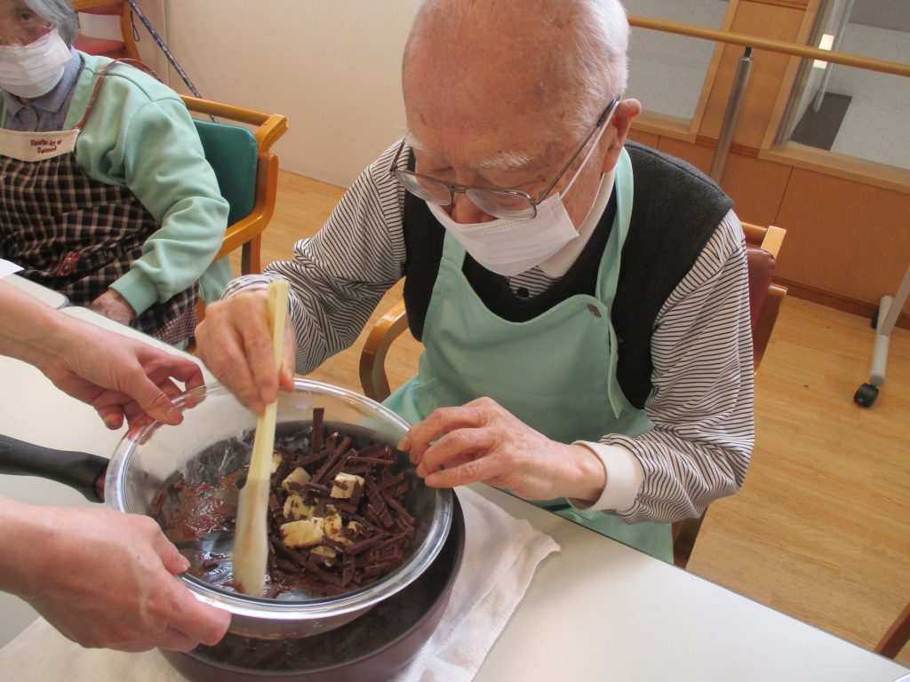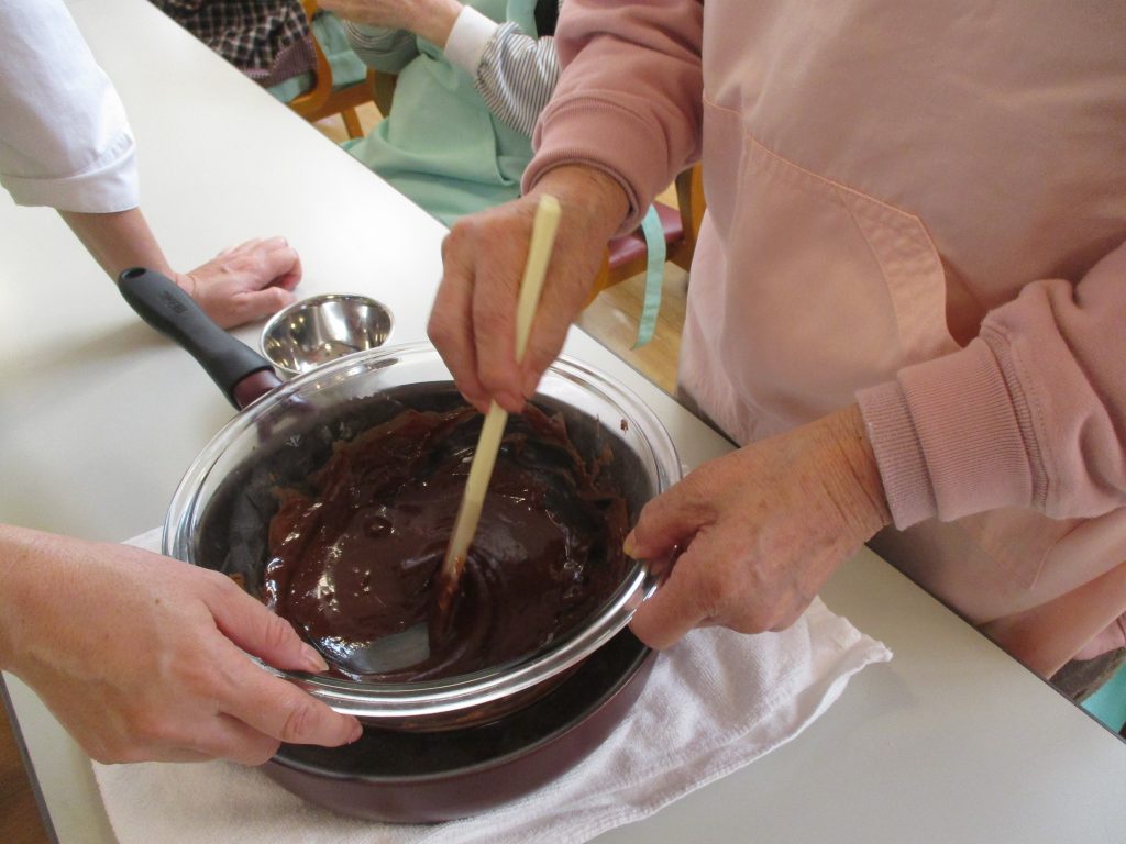 チョコレートのボウルの中に少しずつ入れて混ぜていきます。