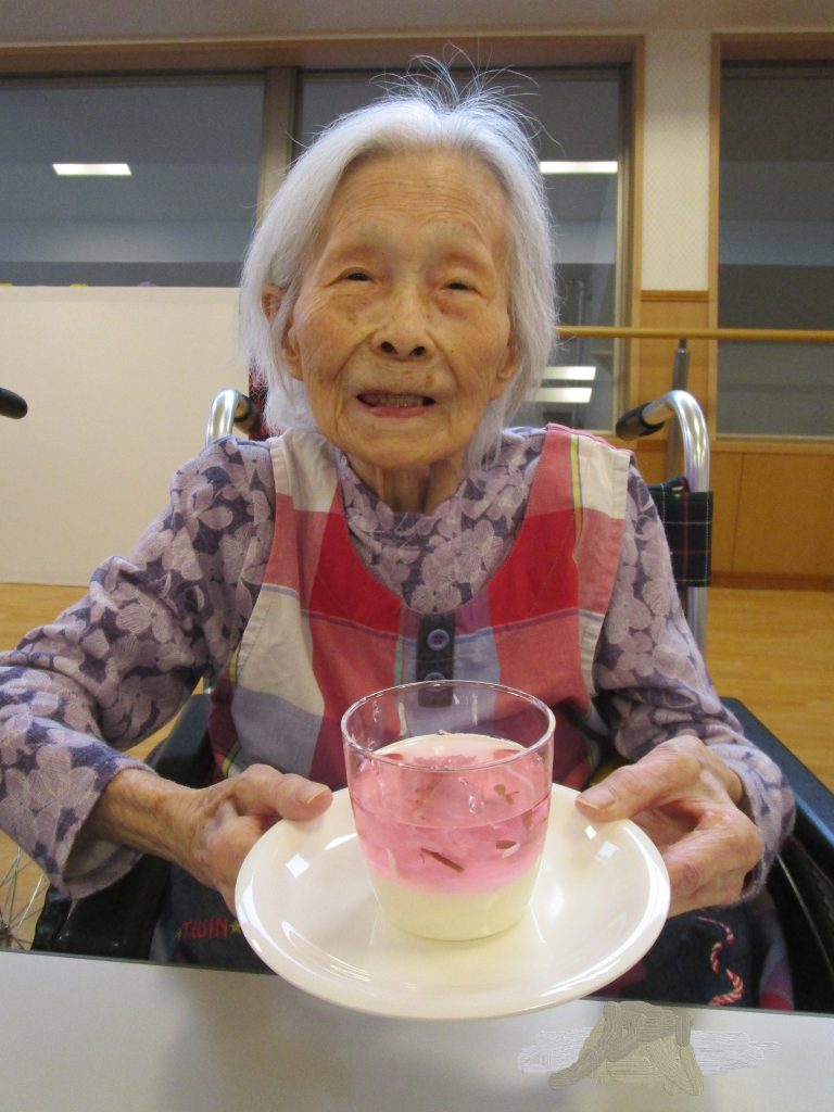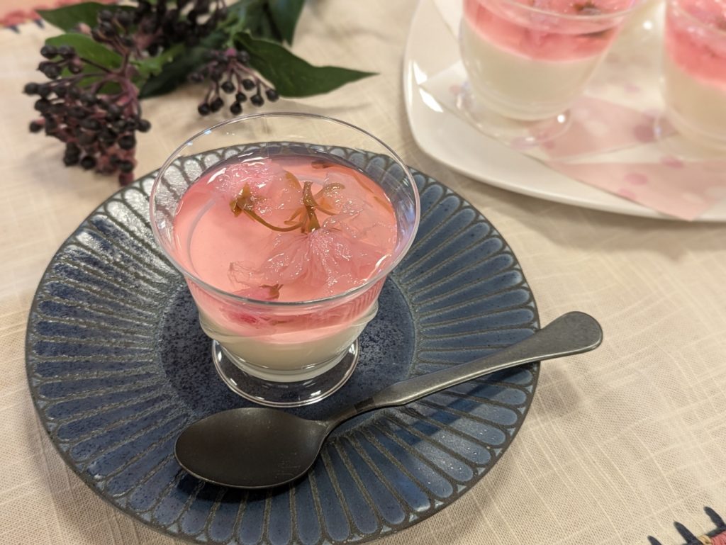淡いピンクと白が春らしさを感じさせる、きれいなさくらゼリー杏仁が出来上がりました(o^―^o)