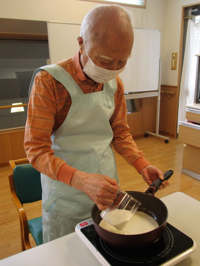 生クリームと牛乳、グラニュー糖、杏仁霜、アガーを火にかけ、沸騰直前まで加熱します。
