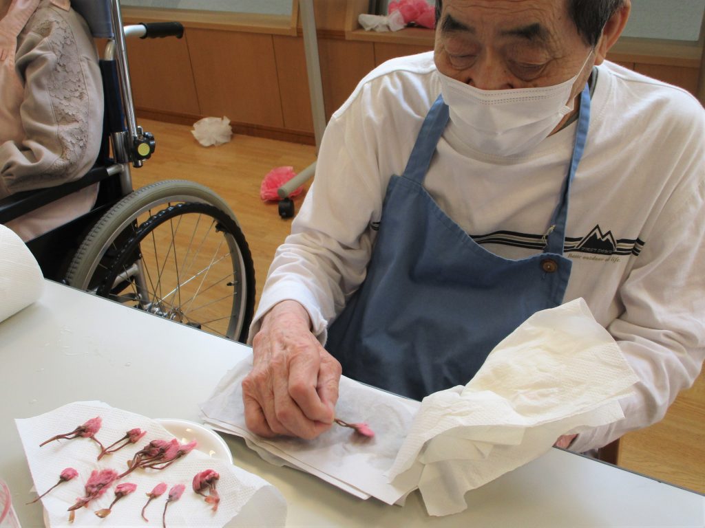こちらは桜の花の塩漬けの塩抜きをし、一輪ずつ広げて水気を取ります。