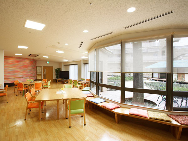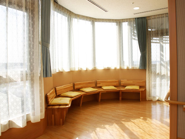 曲線を描いた窓とベンチがやわらかい雰囲気をつくりだしているデイケアルーム。扉を出てすぐのリハビリスペースと合わせ、のびのびとご利用ください。