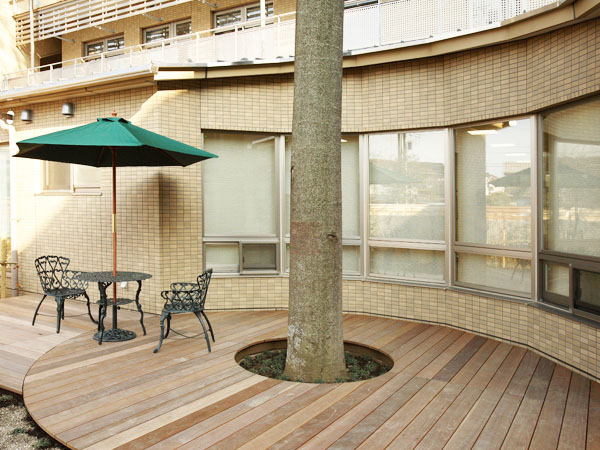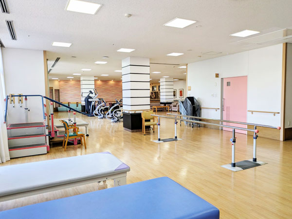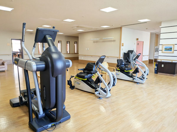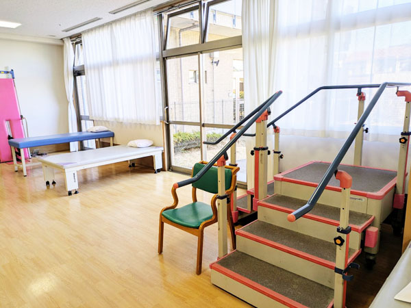 1階ホールには、広々としたリハビリスペースがあり、入所・ショートステイ・デイケアのご利用者様にお使いいただいています。大きなガラス窓からは、リハビリをしながら中庭をはさんで託児所の子どもたちが遊ぶ姿がみられることもあります。このほか、入所・ショートステイは各フロアでもリハビリを実施しています。