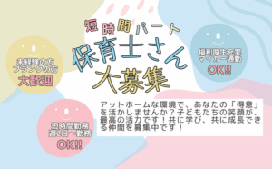 | 仕事内容 | ・院内保育所で、職員のお子さん(生後9週~未就学児童)をお預かりしています。 ・細かい書類作成などが無いので、子どもとじっくり向き合えるアットホームな保育所です。 ・夜間保育業務、病後児保育も行っています。 |