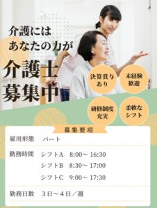 小規模多機能型居宅介護(通所・宿泊・訪問)通所者10~15名/1日・生活支援全般のお仕事です。